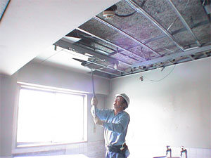 岩綿吸音板 クリーンルームを置いた全養生下でのバール破砕
