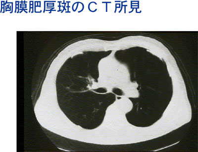アスベストの健康障害は簡単に言うと、じん肺の一つのアスベスト肺、肺がん、悪性中皮腫(肺の外の膜にできるがんの一種は悪性胸膜中皮腫)の3種類があります。腹膜の回りにできる中皮腫は悪性腹膜中皮腫と言います。もう一つは、良性の変化ですが、胸膜肥厚班があります。(図2)