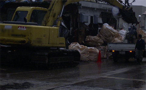 小千谷市建設課の方と別れ、市内の状況を視察しました。なおここまでの視察はNHK総合TVで12月1日夜報道されました。小千谷市商店街では、民家の解体が始まりつつありました。