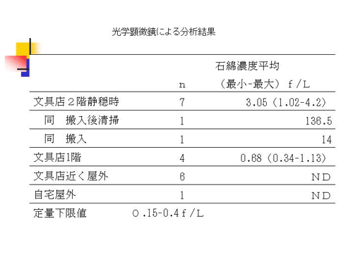作業環境測定士の外山さんの測定データですが、自宅の屋外や文房具店の外の屋外は定量下限値以下、基本的には0.1f/Lとかの値でございます。文房具店の1階が0.68 f/L、静かな状態でも2階は3.05f/L、物を搬入すると床の石綿が飛び散りますから、14 f/L。さらに掃いたりすると136 f/Lと。普通の状態では3.05f /Lということで、石綿濃度は職業性曝露に比べて非常に低いのです。低濃度の曝露だが、滞在時間が長い方という事が良くわかりました。