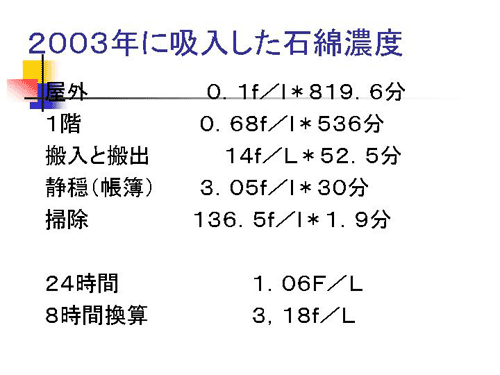 これは2003年に測定したのですが、実際にだいたいどれくらいご自分がどういう環境に滞在したのかというものを計算して、平均化しますと、24時間ですと1.06 f/L、8時間換算ですと3.18 f/Lくらいの濃度のところにいらした方というのがわかります。