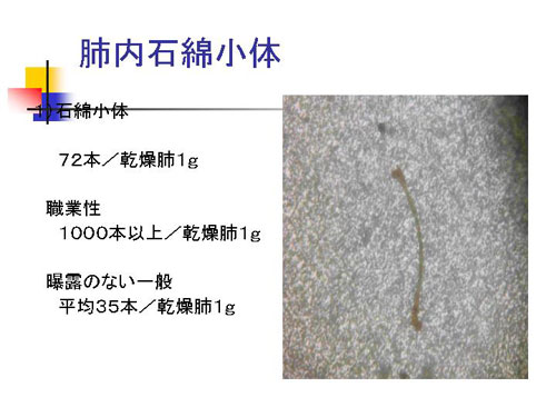 残念ですがお亡くなりになりまして、解剖した肺を調べますと、乾燥肺の1グラム中に72本の石綿小体が検出されました。これは石綿の繊維を中心にして、たんぱく質と血液由来の鉄等が付きまして、茶色く見えるのです。石綿に特徴的なこの石綿小体が1グラムあたり72本で、全く曝露の無い方は乾燥肺1グラム中35本くらいです。職業性石綿曝露の方は、乾燥肺1000本から1万本の単位です。ちょうど全く曝露の無い方の2倍、職業性の方と比べると一桁オーダーが低いという状態です。