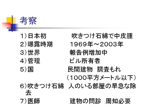 諸外国では、吹き付けのある建物からの中皮腫の発症が徐々に起きています。この方は日本で初めて、吹き付けの石綿のある建物で中皮腫になった訳です。曝露期間は1969年から2003年で今年2005年は、ちょうど石綿吹き付けが始まった建物の方の潜伏期がそろそろ始まる時期にあたっています。本来誰が吹きつけ石綿を管理するかというと、ビルの所有者に当然なるでしょう。しかし国も民間の建物の調査を定期的にしていかなくてはいけないのですが、国土交通省の現在の通達では1000平米以上が対象となっていますから、今回の小規模な建物については今も把握されていません。そういう中でこういう被害が始まっているということでございます。吹き付けの石綿については、少なくとも人の居る部屋について早急な除去が必要です。また今まで中皮腫となると、アスベストの仕事はございませんでしたかと聞いてきたわけですが、今後は建物についてもすべて問診をして調べていくということが必要な時代になってきたということであります。
