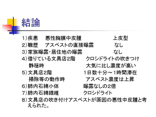 結論ですが、職歴は無く、家族曝露、居住地の曝露は無くて、クロシドライトの吹き付けがある建物で、静かな段階でも大気に比べて濃度が高い状態で、1日数十分から1時間くらい滞在していた方が、中皮腫を発症された。肺内の石綿小体がだいたい曝露なしの2倍くらいで、繊維としてはクロシドライトが出てきたということです。