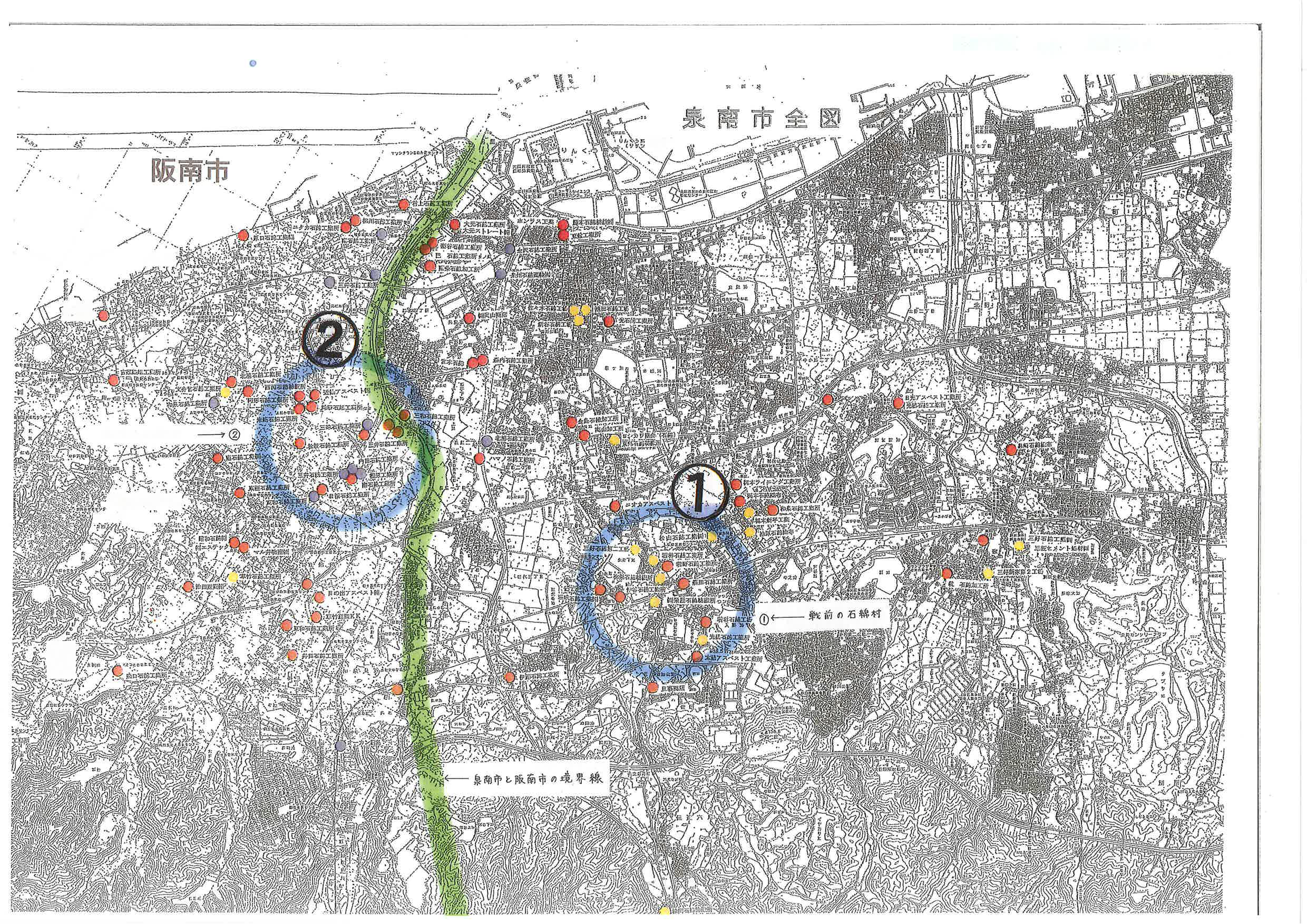 明治時代から大阪・泉南には多くアスベスト紡績工場があり、その工場で働いていた元従業員と家族が労災患者として、また家族ばく露、環境ばく露として多数知られていた。この図は泉南地域の工場が、赤や黄色、青、緑で示されています。